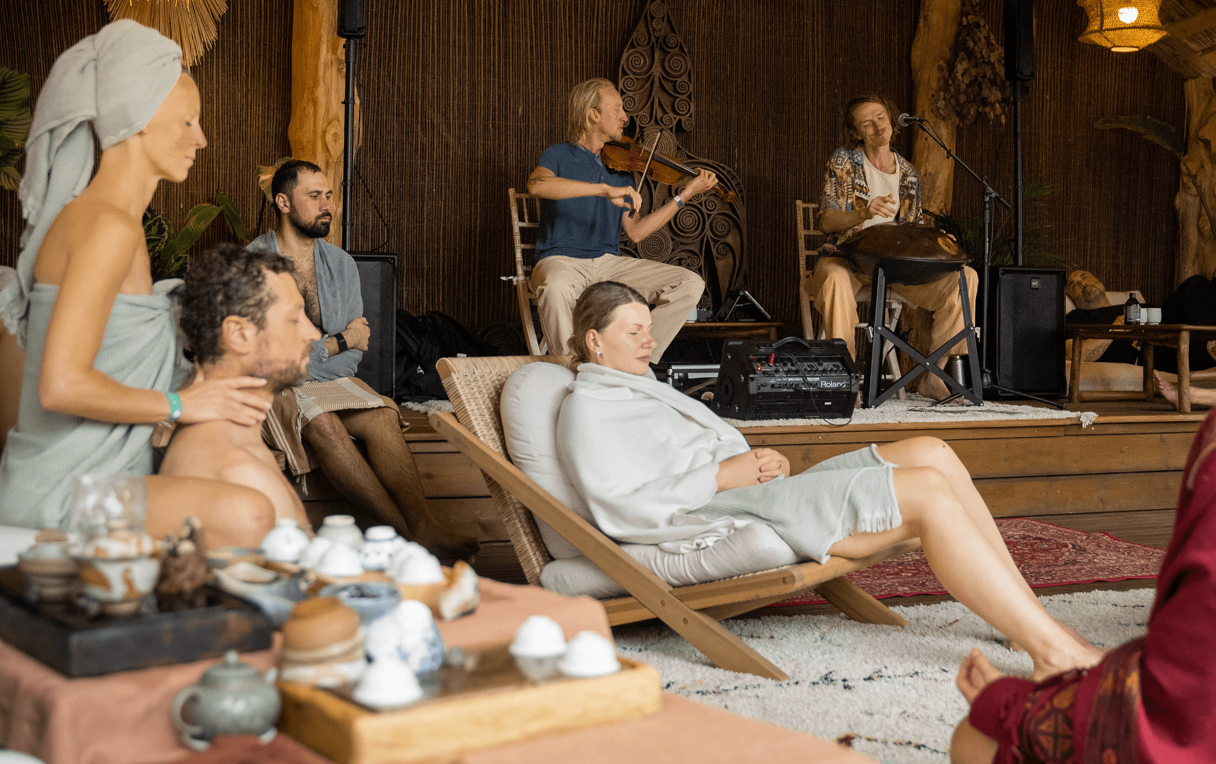 Steam Flow is an open gathering, rooted in the tradition of warmth as a communal space. Guests are invited to come and go at their own pace throughout the day, relaxing in the steam dome. A live music concert unfolds among the pine trees.